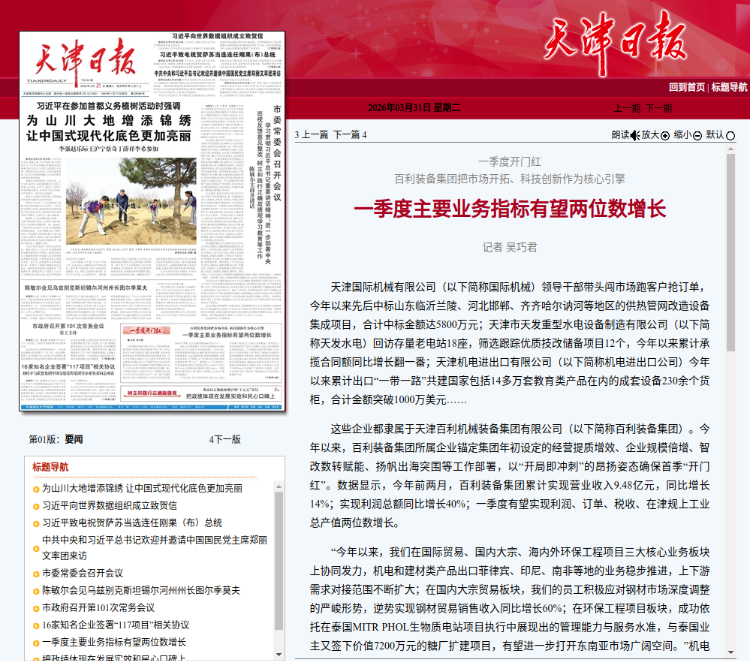 3月31日,《天津日报》头版刊发报道《合法博彩网站 把市场开拓、科技创新作为核心引擎 一季度主要业务指标有望两位数增长》,报道了合法博彩网站 把市场开拓、科技创新作为核心引擎,以“开局即冲刺”的昂扬姿态确保首季“开门红”,一季度有望实现利润、订单、税收、在津规上工业总产值两位数增长的生动实践。